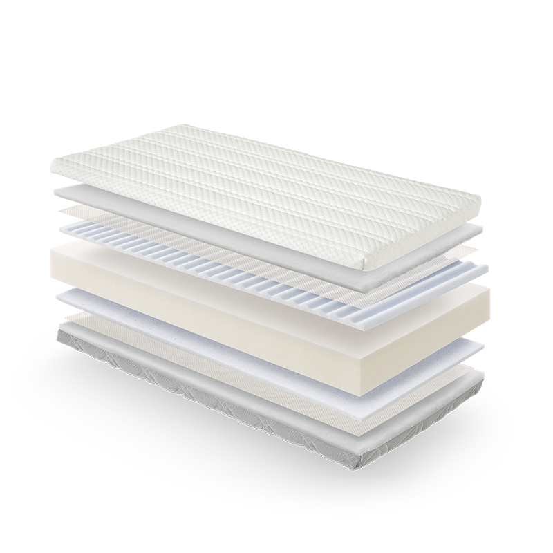 ¿Qué materiales componen las capas del colchón? El colchón está compuesto por una estructura multicapa que incluye tejido Strech, fibra, TNT, Visco Innogel perfilada, núcleo de espuma de 23 kg y una base de malla 3D para máxima ventilación.
