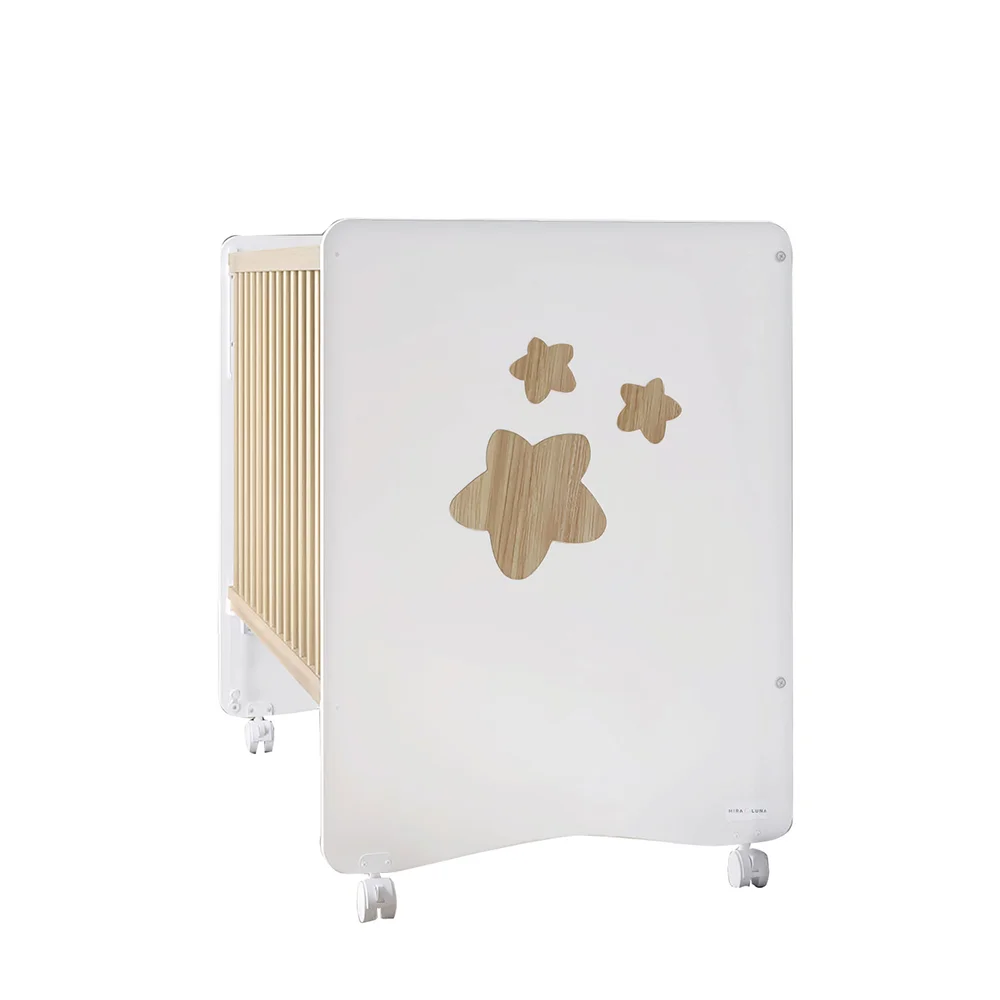 La Cuna Atria de la línea exclusiva MiraLuna by Trama destaca por su diseño equilibrado y sus acabados de alta calidad. Lo que hace única a esta cuna de 120×60 cm es el contraste decorativo de su panel central, que incorpora preciosos apliques de madera en relieve en tono Tola, creando un efecto visual cálido y sofisticado sobre el fondo blanco mate.