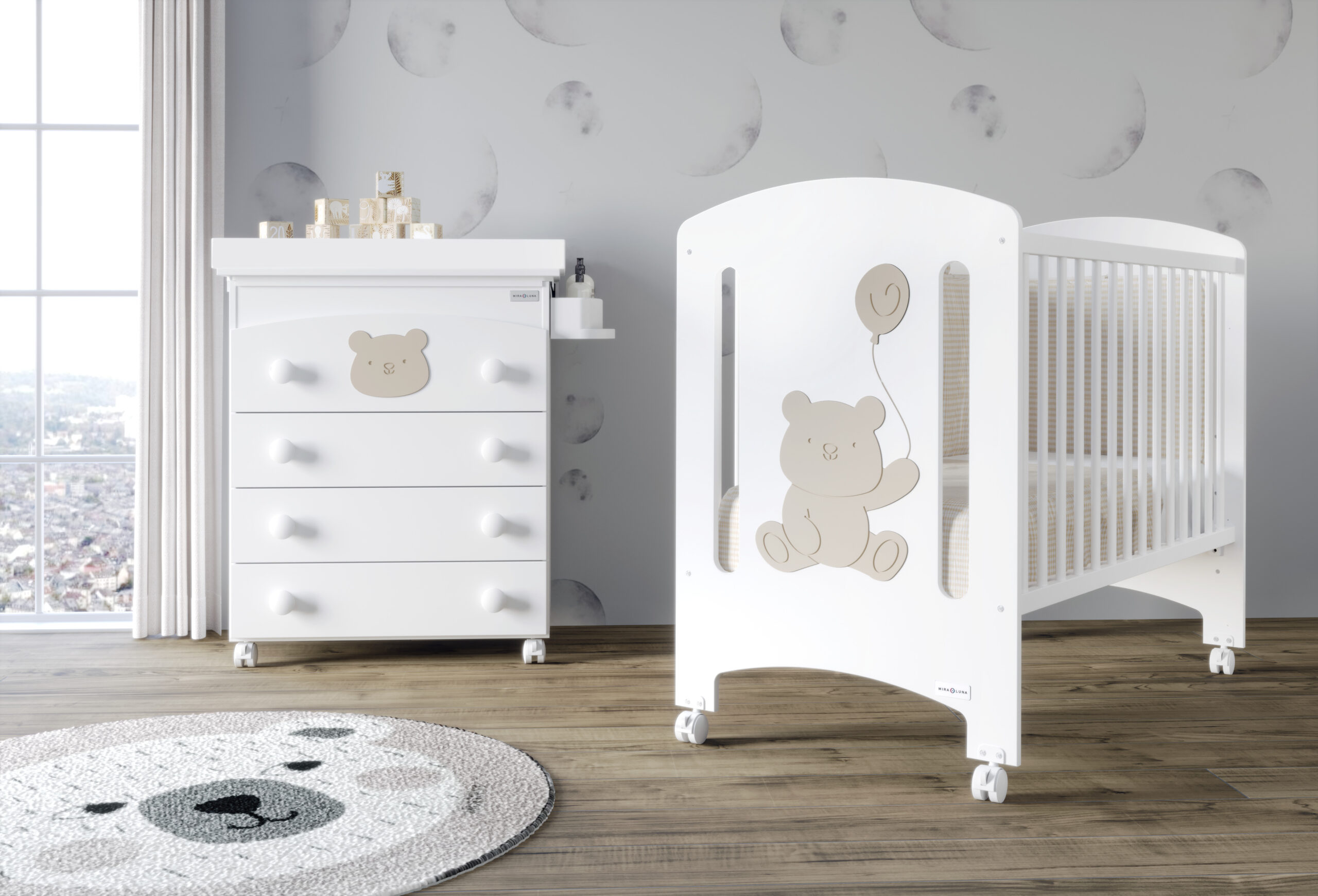 Diseño con Osito MiraLuna: A diferencia de otros modelos más sobrios, la Tamy incluye un grabado de un osito en su panel central. Este detalle aporta una estética dulce y reconfortante, convirtiendo la cuna en el centro de todas las miradas.