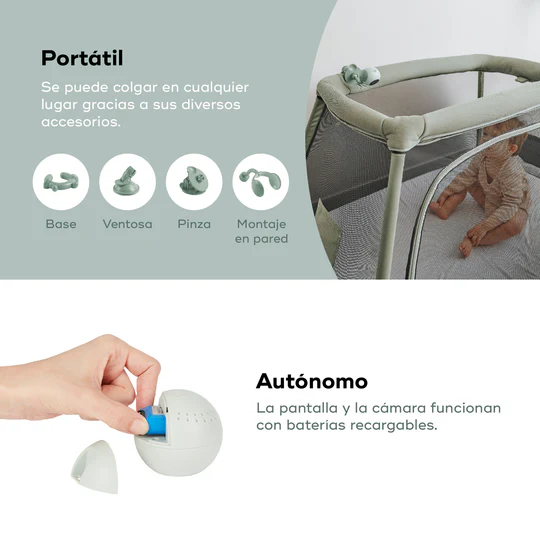 4 Soportes de fijación: Incluye ventosa para cristales, pinza para la cuna, trípode flexible y soporte de pared. Por lo tanto, podrás instalarlo en cuestión de segundos en cualquier habitación o lugar de vacaciones.